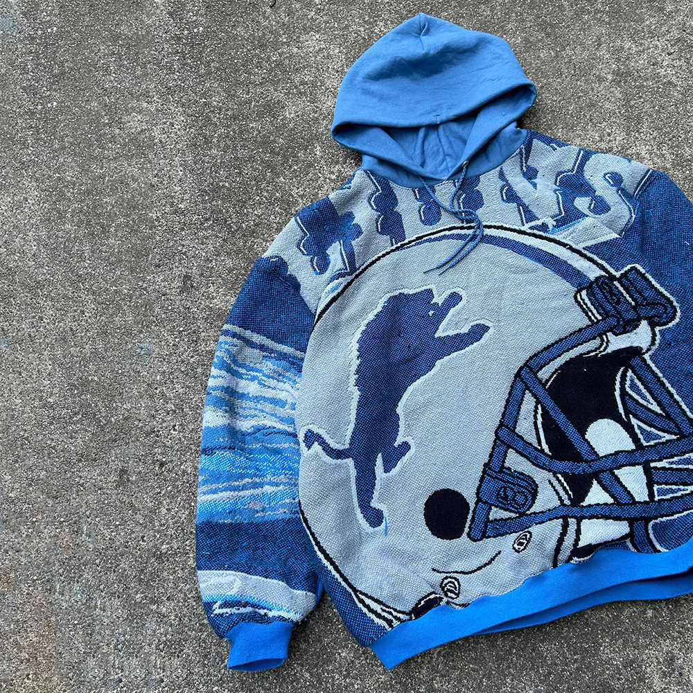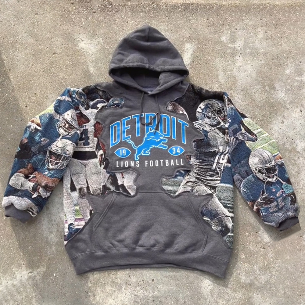 Detroit Lions Men's Retro Western Style Waffle Panel Suede Fur Collar Hooded Sweatshirt