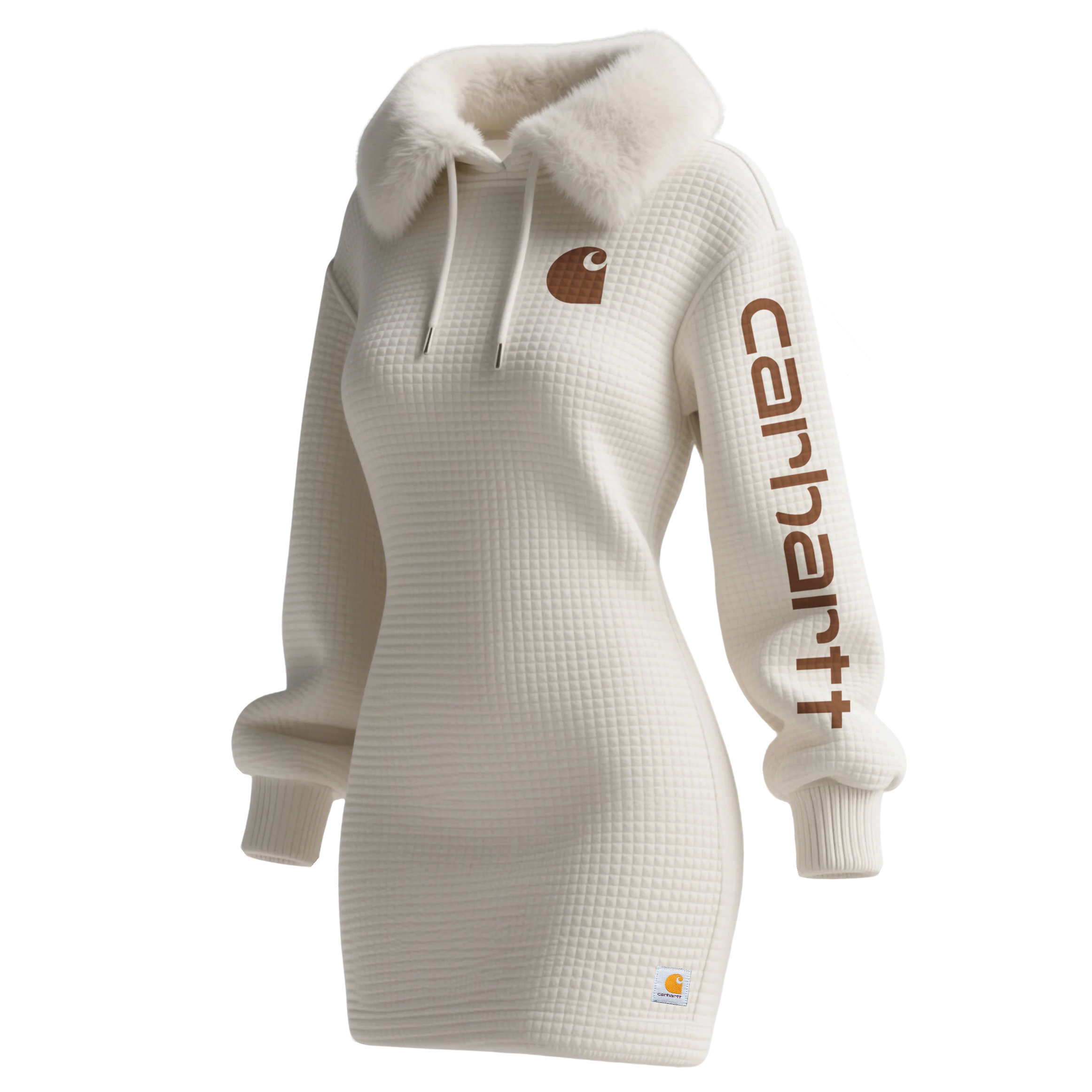 Women's Waffle-knit Long Sweatshirt Dress With Fur Collar
