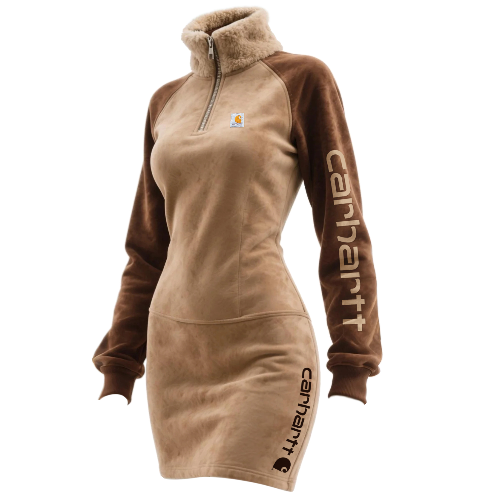 Women's Retro Western Suede 1/4 Zipper Fur Collar Stand Collar Long Dress Sweatshirt