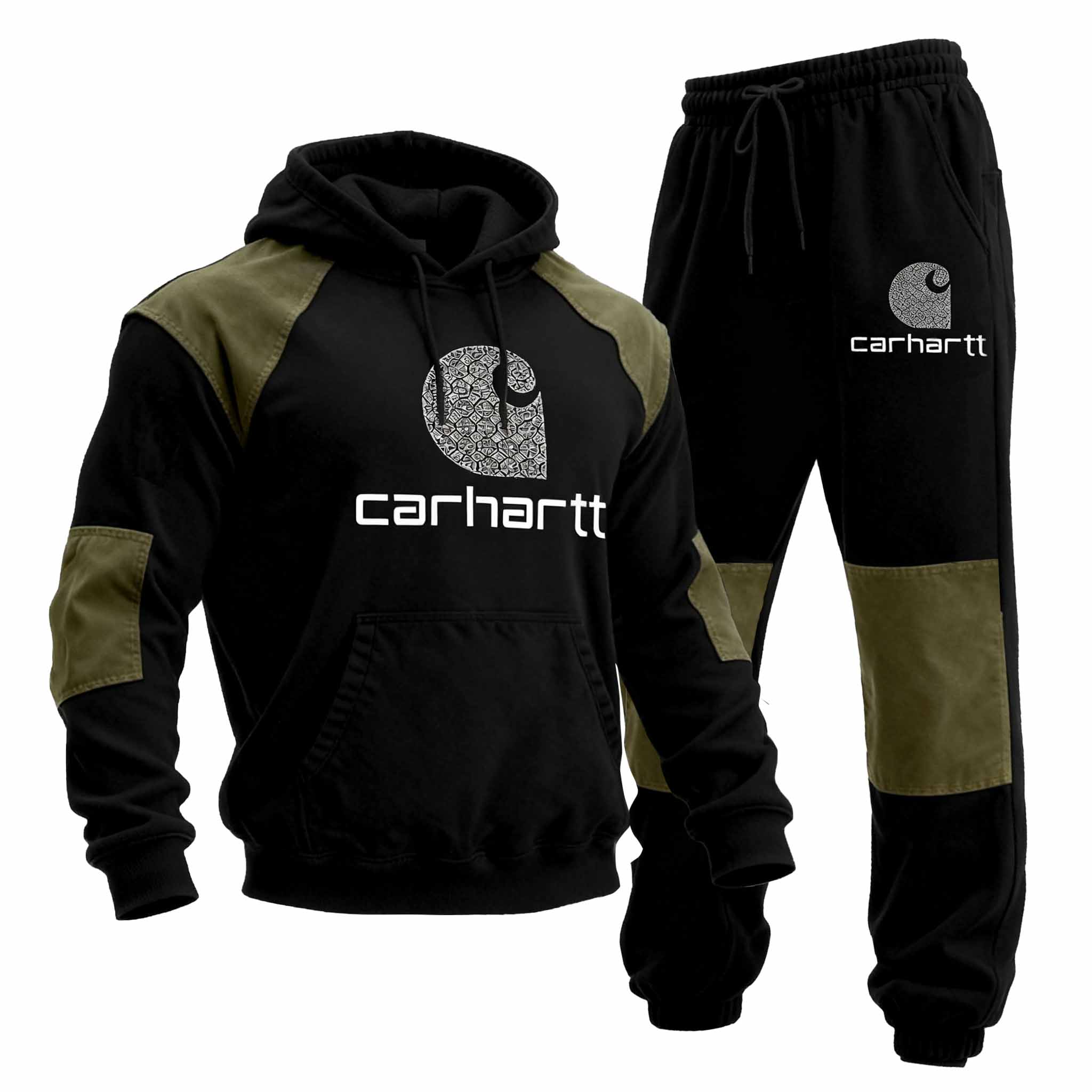 Men's Vintage Black Stitching Army Green Pocket Hoodie And Sweatpants Jogger Set