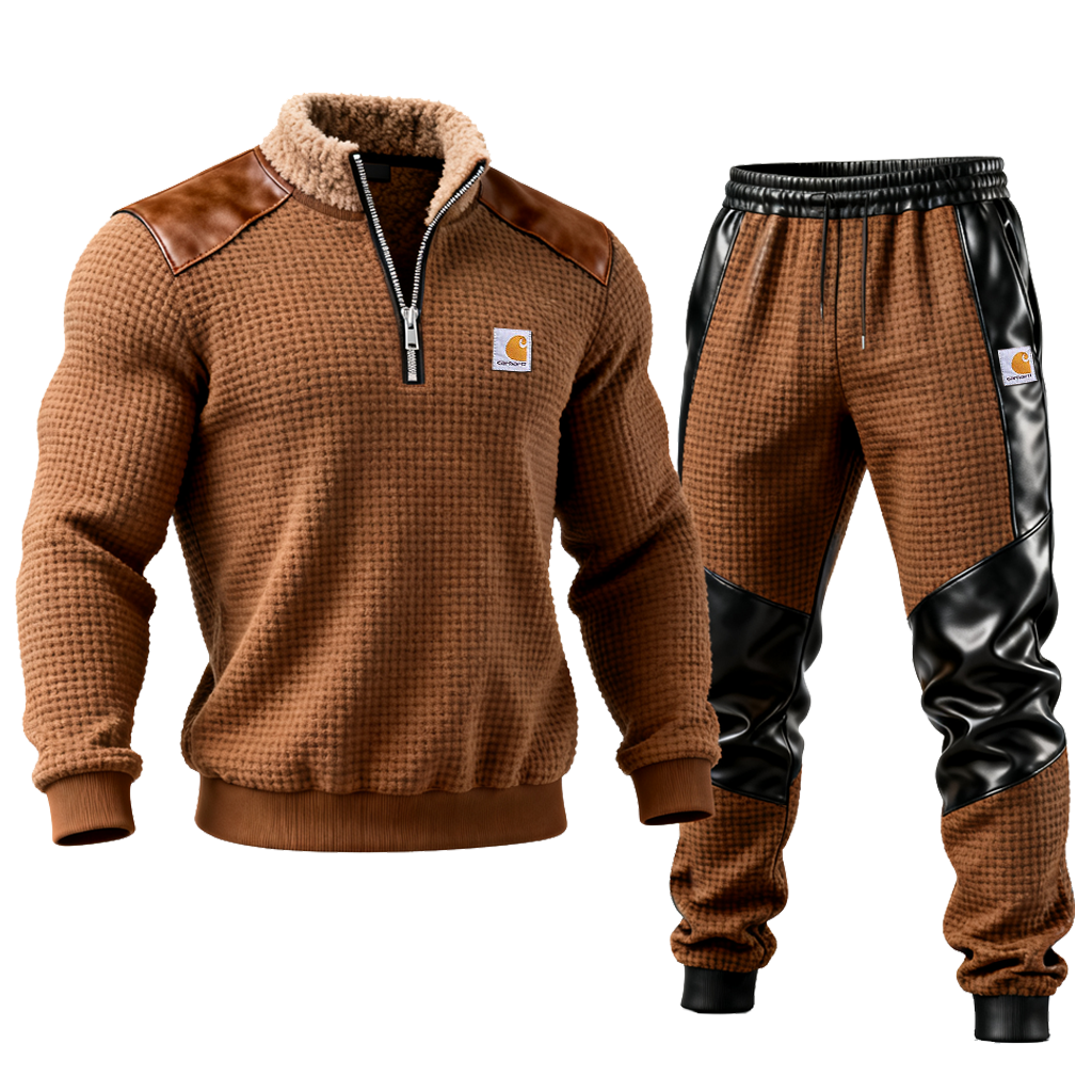 Men's Retro Casual Brown Waffle Knit Tracksuit With Leather Accents