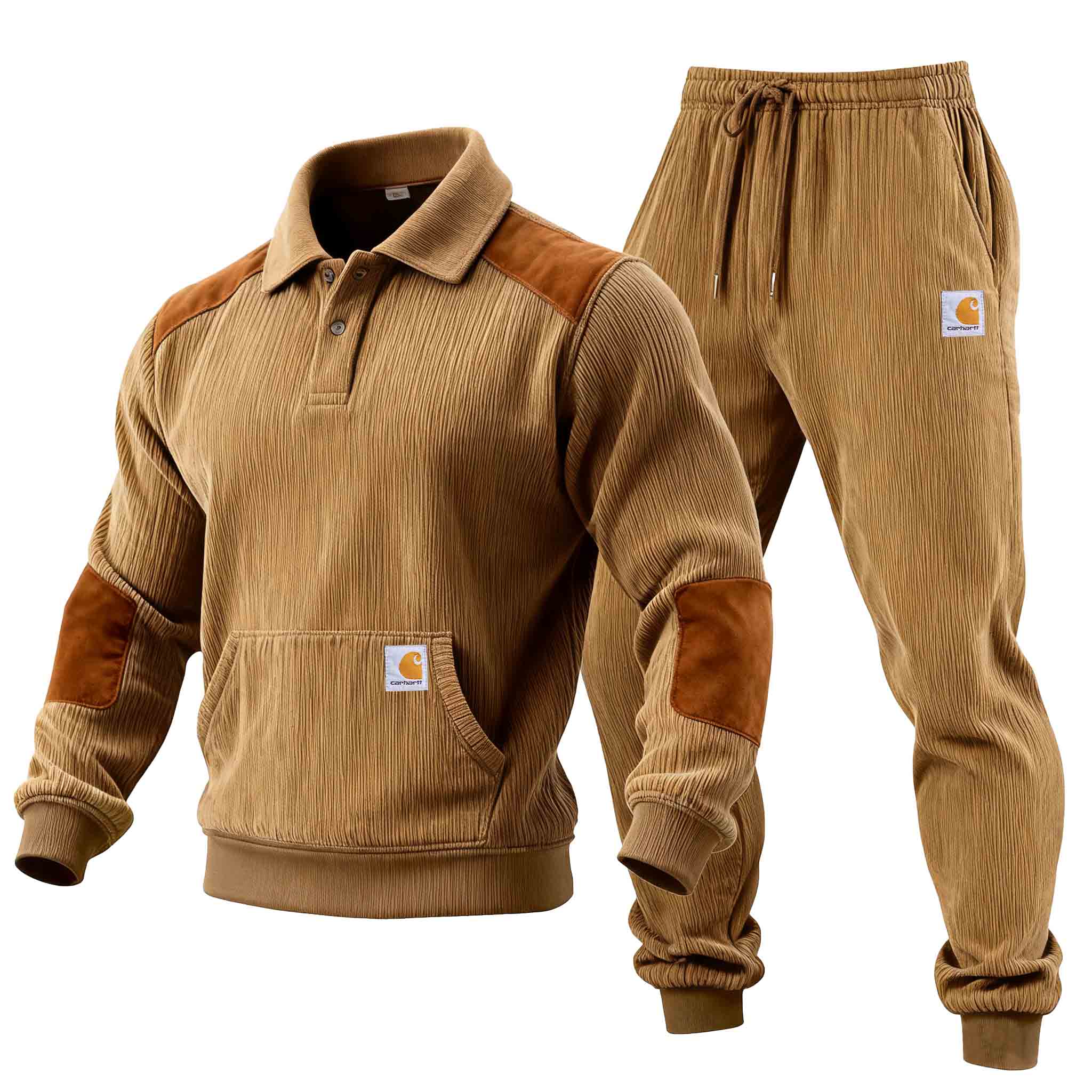 Men's Vintage Khaki Corduroy And Suede Polo Collar Sweatshirt And Sweatpants Jogger Set