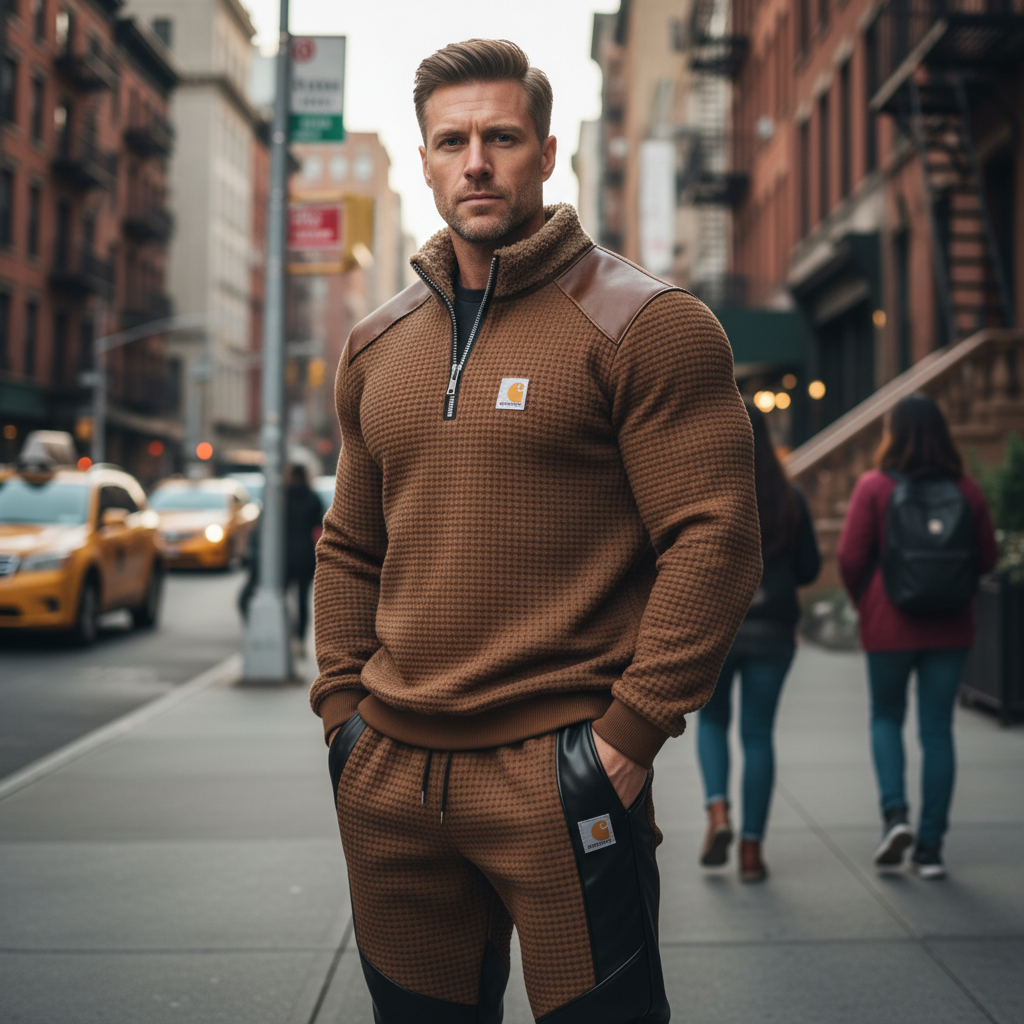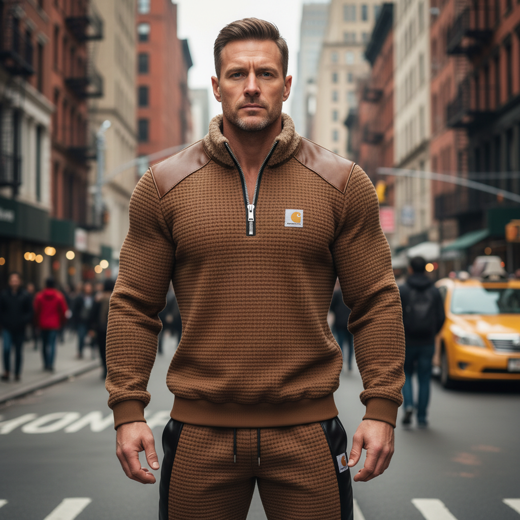 Men's Retro Casual Brown Waffle Knit Tracksuit With Leather Accents