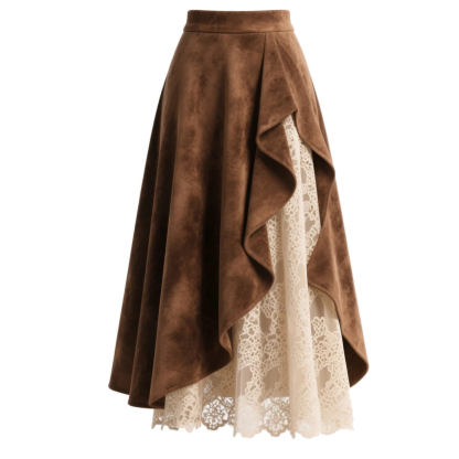 Retro Western Style Irregular Design Suede Patchwork Lace Skirt