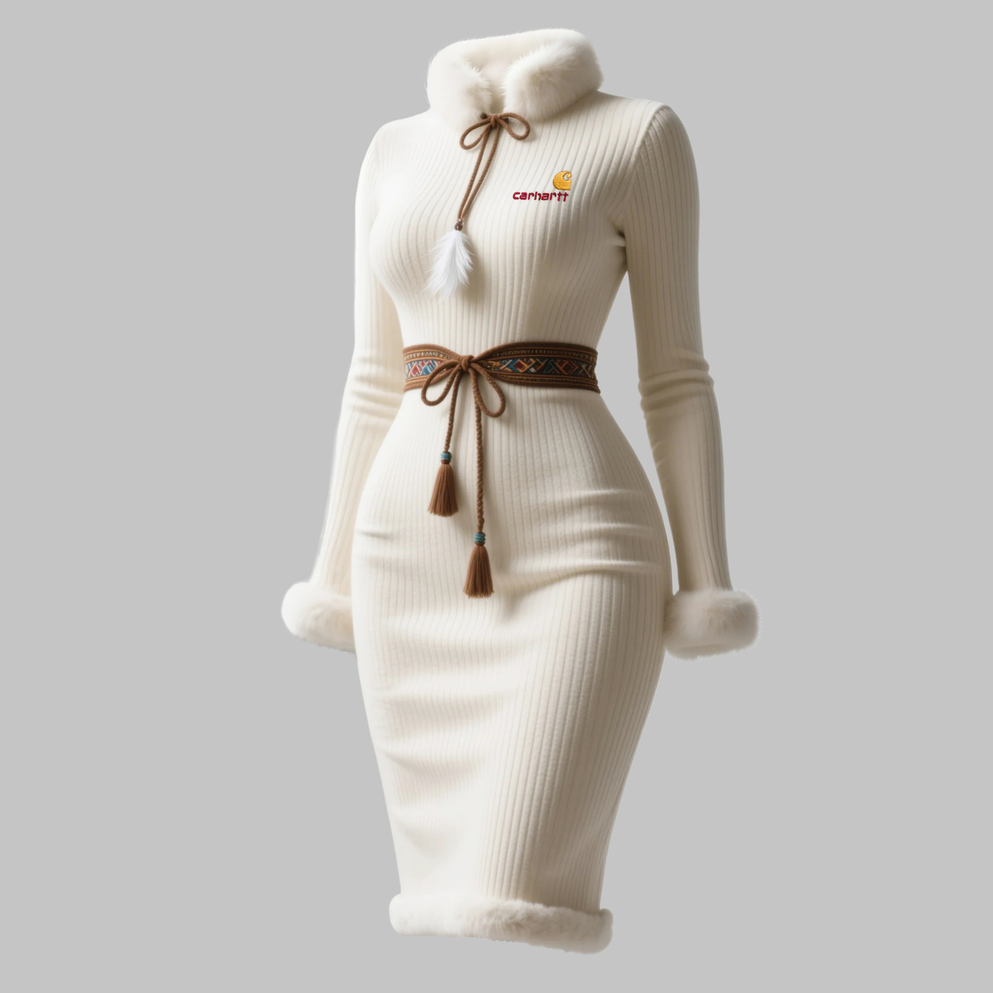 Women's Retro Ethnic Style Round Neck Slim-fit Dress With Detachable Fur Collar.