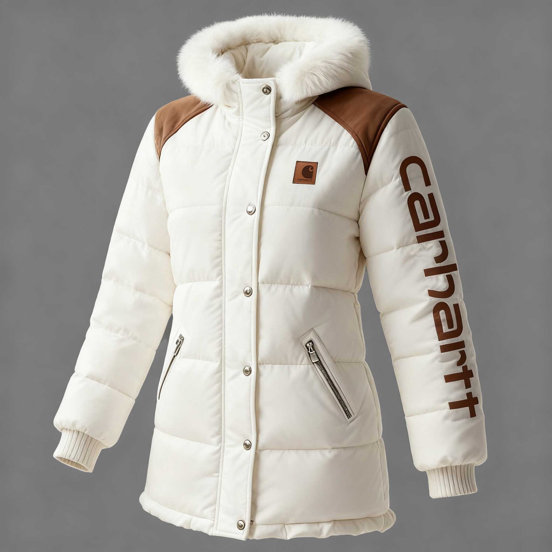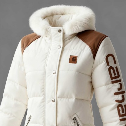 Women's Vintage Winter White Puffer Brown Suede Hooded Fur Trim Jacket